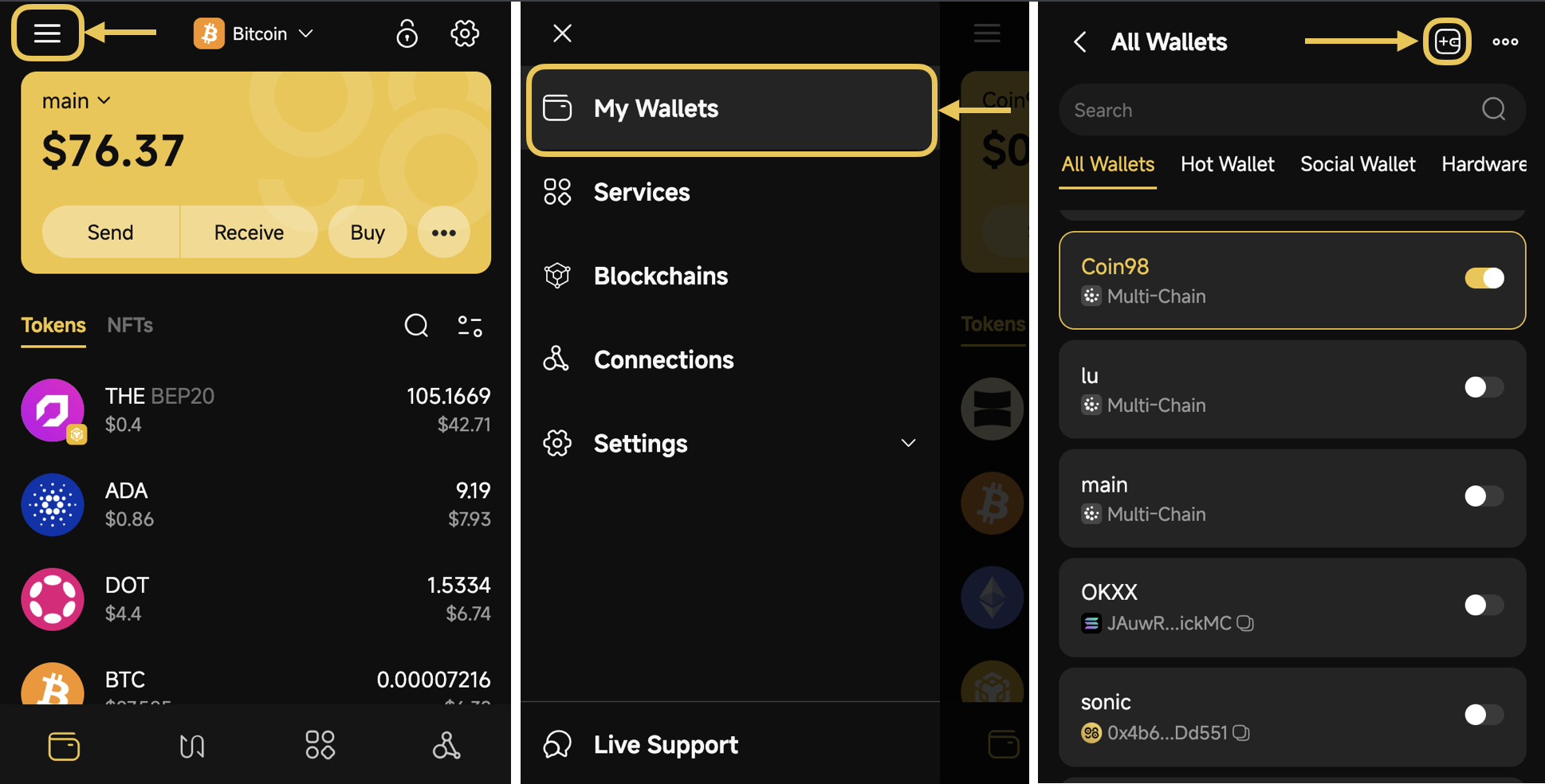 To create additional wallets from the second one onward, please click the **Add wallet icon** at the top-left corner of the All Wallets section, then follow the same steps as&#x20;