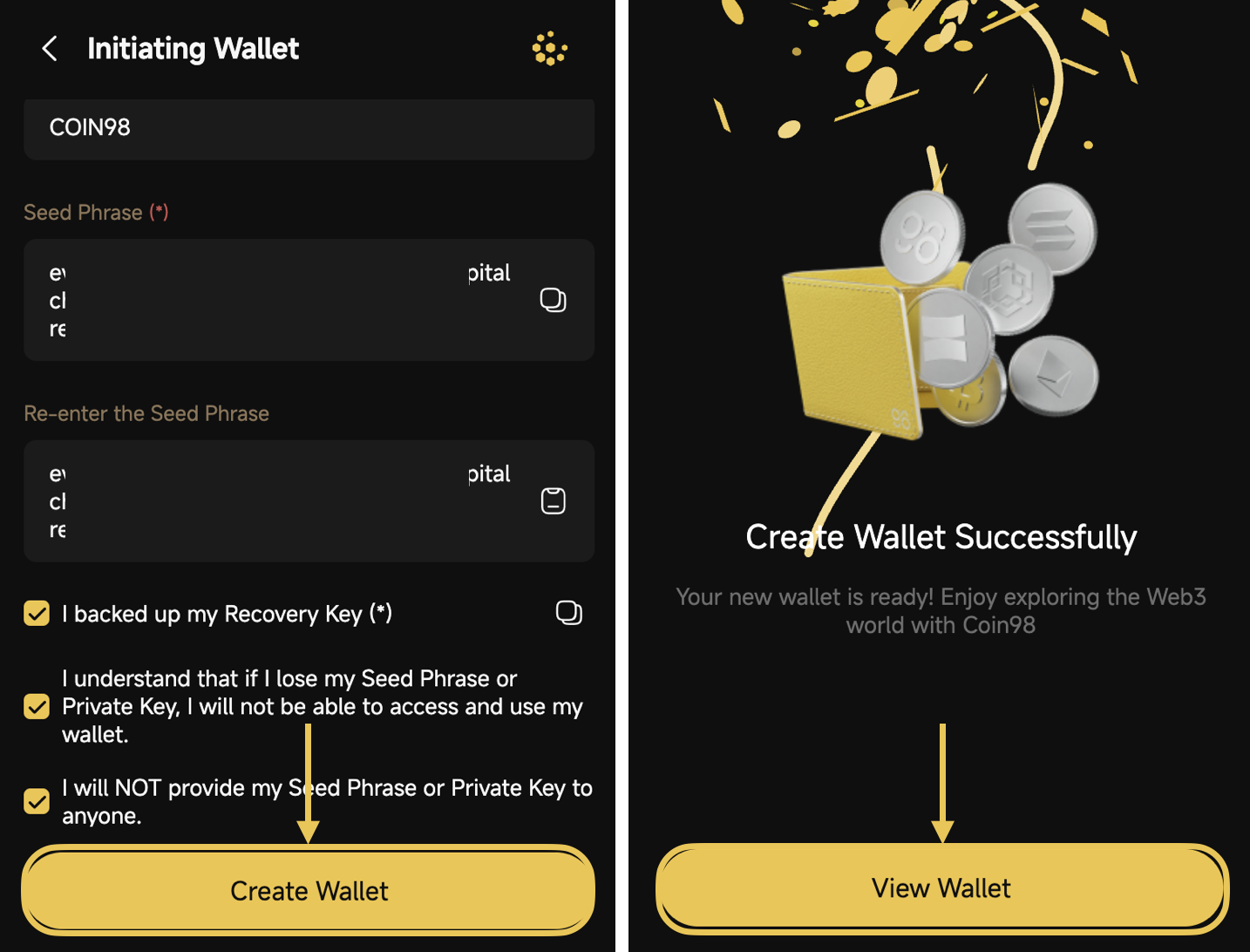 <figure><img src="https://2549780185-files.gitbook.io/~/files/v0/b/gitbook-x-prod.appspot.com/o/spaces%2FirKWZRA5WMZ5uBeDGB96%2Fuploads%2FqtQnbel5bXaDRlaaP80W%2Fcoin98-ext-create-wallet-3.png?alt=media&#x26;token=463a7c0e-7f3b-4434-bda3-ef4eab26b799" alt="" width="563"><figcaption></figcaption></figure>