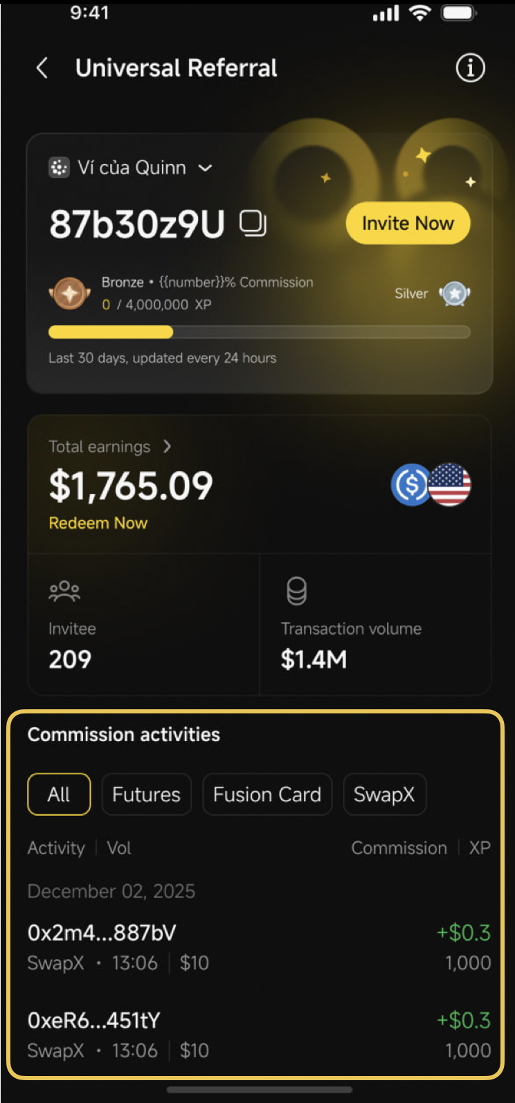 **Note**: The system refreshes daily at 00:00 (UTC+7). All XP earned during the day will be added to your total after the refresh. For example, if your invitee makes a transaction at 7:00 AM, the XP you earned will be credited after 00:00 on the following day.
