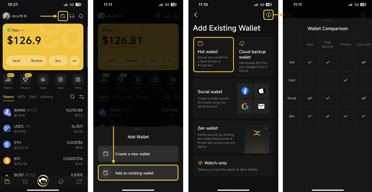 Nếu bạn không nắm rõ về các loại ví này, bạn có thể tham khảo bảng so sánh các loại ví bằng cách nhấp vào biểu tượng ở góc trên bên phải.