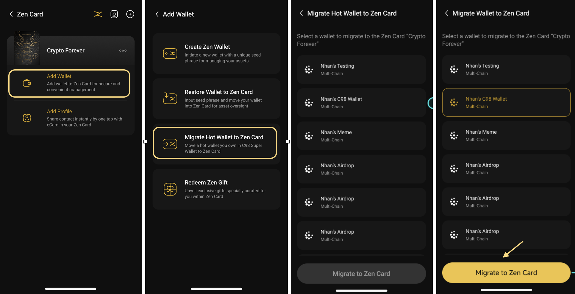 **Bước 1:** Chọn ví nóng (**Hot Wallet** là ví Multi- chain) hiện có mà bạn muốn chuyển đổi, sau đó nhấn vào **Di chuyển dữ liệu sang Zen Wallet (Migrate to Zen Card)**;