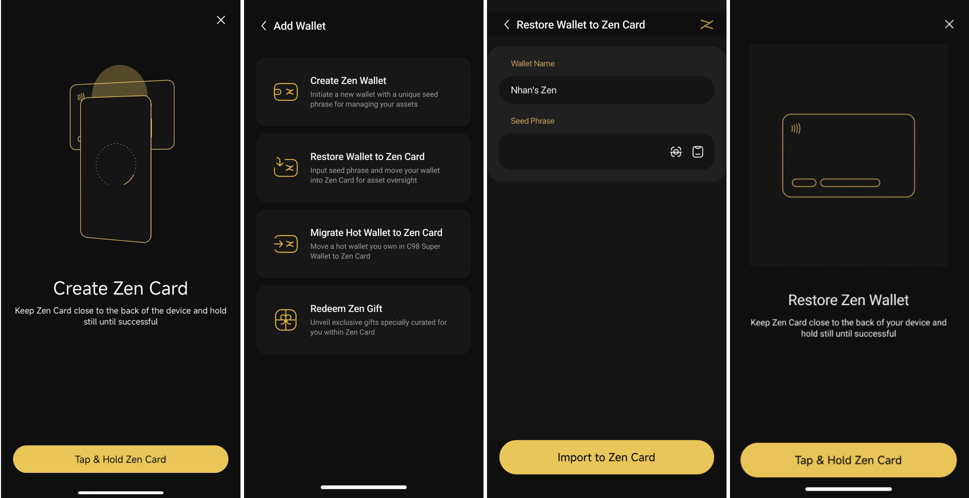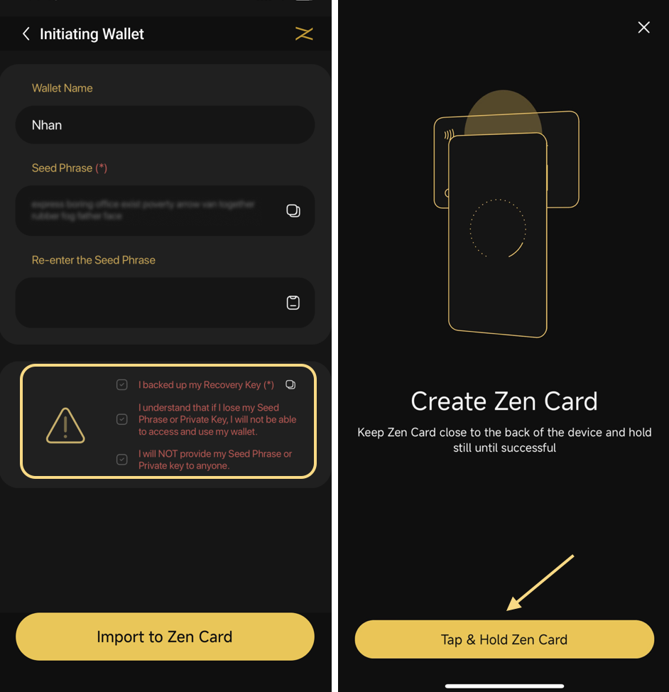 **Bước 1**: Nhập tên ví mong muốn và Seed Phrase của ví mà bạn muốn khôi phục vào Zen Card;