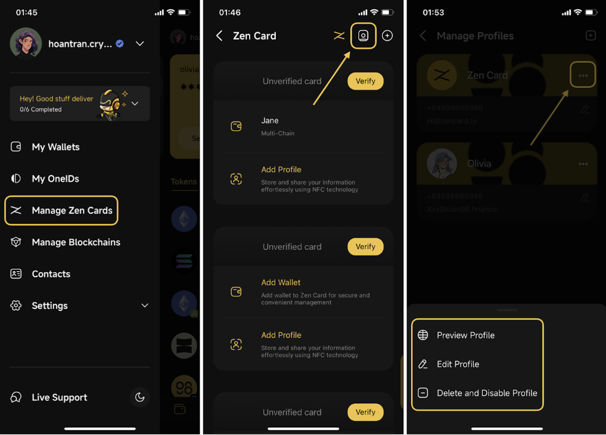 Trước khi tiến hành thiết lập một hồ sơ mới cho eCard, bạn cần đảm bảo rằng đã thêm ít nhất một Zen Card vào Coin98 Super Wallet. Vui lòng làm theo hướng dẫn tại đây về [Cách Thêm Zen Card](https://docs.coin98.com/vn/san-pham/coin98-super-wallet/mobile/vi-zen-card/huong-dan-quan-ly-zen-card)